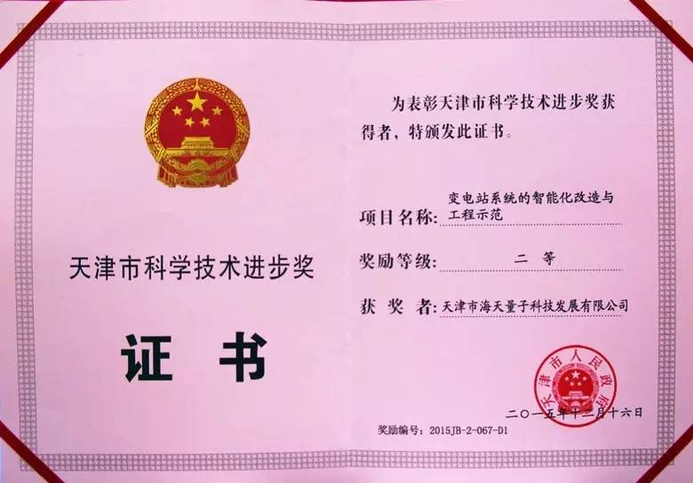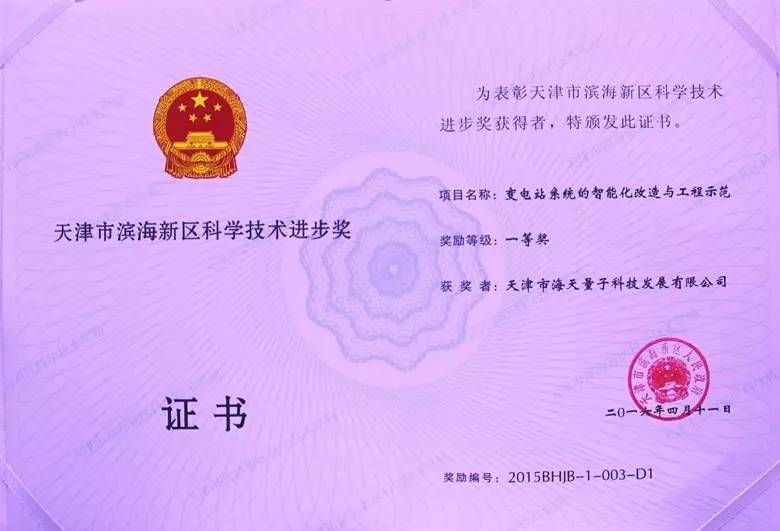 2015年度,天津市共有199项科技成果获奖,其中由我集团下属全资子公司“天津市海天量子科技发展有限公司”申报的《变电站系统的智能化改造与工程示范》项目喜获天津市科学技术进步二等奖,滨海新区科学技术进步一等奖。